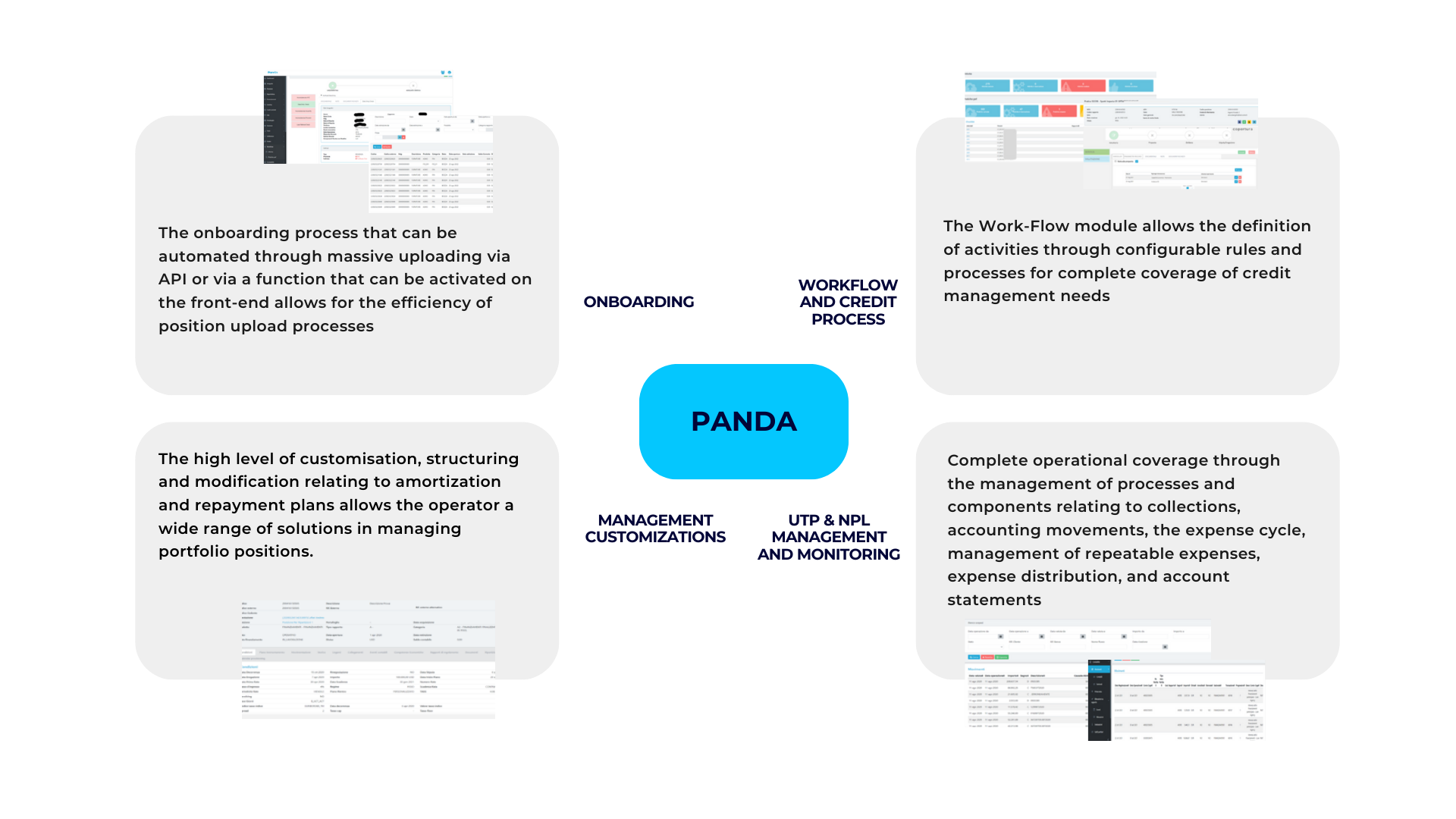 Panda è un software gestionale finanziario basato su piattaforma web che offre diversi moduli, tra cui uno dedicato alla gestione dei portafogli UTP (Unlikey To Pay) e NPL (Non-Performing Loans), attivabili in base alle esigenze dei clienti.